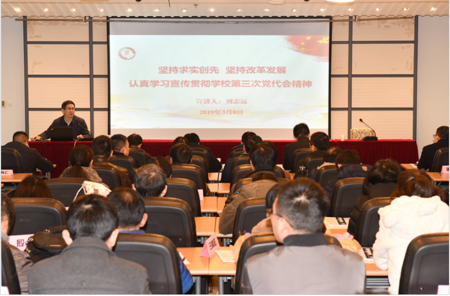为深入学习贯彻学校第三次党代会精神,3月8日中午,校党委副书记刘志远在行政楼一楼学术报告厅为威廉希尔全体教职工作了题为“坚持求实创先,坚持改革发展,认真学习宣传贯彻学校第三次党代会精神”的宣讲。会议由学院党委书记张祚键主持。